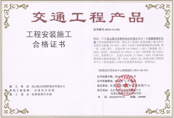 交通工程产品工程安装施工合格证书