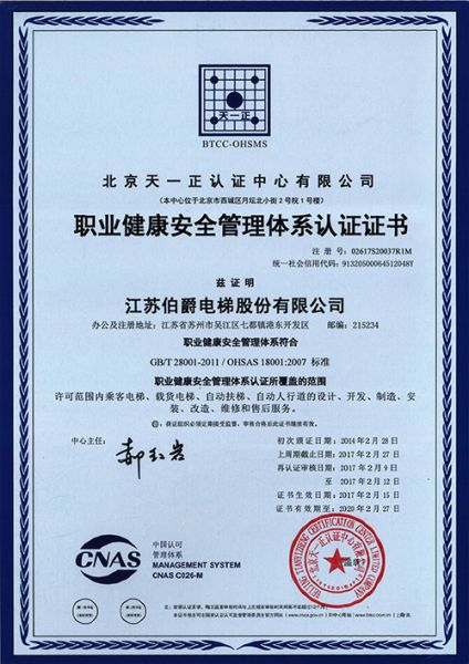 职业健康安全管理体系认证证书